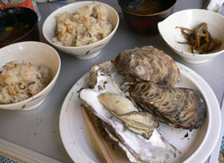 牡蠣飯と牡蠣のお味噌汁、牡蠣の佃煮をサービスで頂いて、