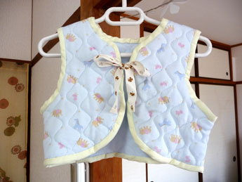 肌着と違って並縫いが少なく、周りをぐるりとバイアステープでくるみます。