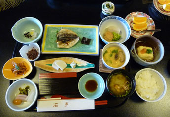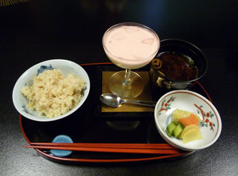 翌日の朝食は、食事30分前の梅干とお茶のサービスから始まります。