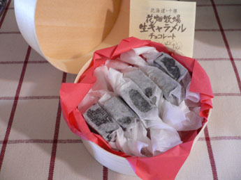 小さな木箱に入れられ、薄紙に包まれた生キャラメル。