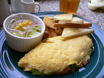 また、オムレツを頼むとプレートにサンドイッチと同じ薄めのパンが