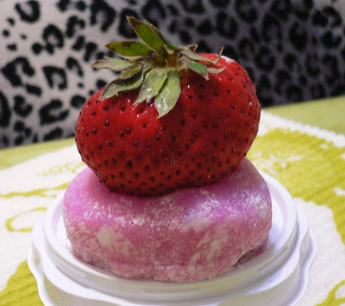 さきっぽが大福の中にうまって、大福にのっかるように飛び出した大きないちご。