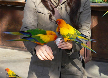 カラフルな熱帯の鳥たちとふれあえます。